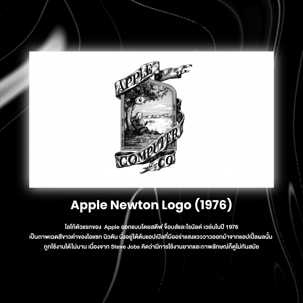โลโก้ตัวแรกของ Apple ออกแบบโดย Steve Jobs และ Ronald Wayne ในปี 1976 เป็นภาพเฉดสีขาวดำของไอแซก นิวตัน นั่งอยู่ใต้ต้นแอปเปิลที่มีออร่าแสงแวววาวออกมาจากแอปเปิ้ลผลนั้น ซึ่งตัวโลโก้ได้รับแรงบันดาลใจจากคำคมของเวิร์ดสเวิร์ธ ที่ถูกใส่ไว้ในโลโก้ว่า “นิวตัน... จิตใจที่เดินทางผ่านทะเลแห่งความคิดอันแปลกประหลาดตลอดกาล” พร้อมตัวฟอนต์ในริบบิ้นประดับว่า “Apple Computer Co.” แต่แต่โลโก้ตัวนี้กลับถูกใช้งานได้ไม่นาน เนื่องจาก Steve Jobs คิดว่ามีการใช้งานยากและถาพลักษณ์ก็ดูไม่ทันสมัยนั่นเอง