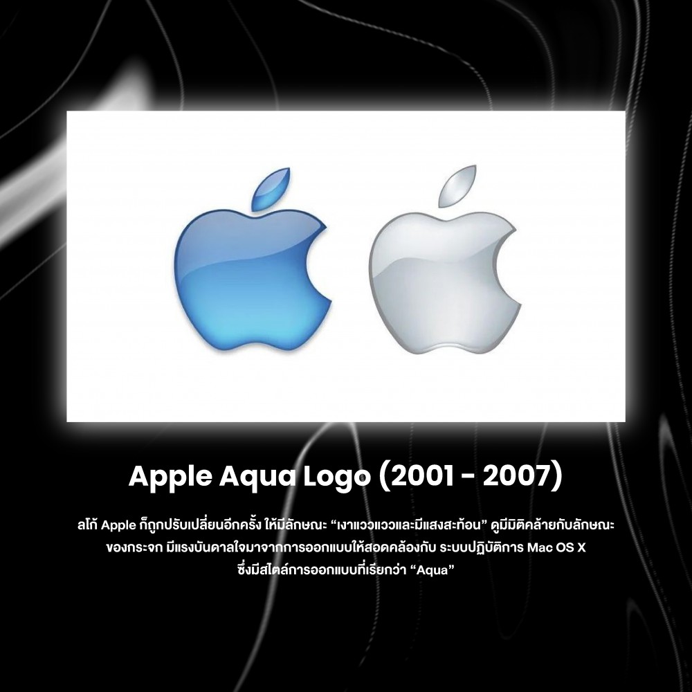 แต่แบบ Monochrome ก็เป็นโลโก้ทางการได้ไม่นาน โลโก้ Apple ก็ถูกปรับเปลี่ยนอีกครั้ง ให้มีลักษณะ “เงาแววแววและมีแสงสะท้อน” ดูมีมิติคล้ายกับลักษณะของกระจก มีแรงบันดาลใจมาจากการออกแบบให้สอดคล้องกับ ระบบปฏิบัติการ Mac OS X ซึ่งมีสไตล์การออกแบบที่เรียกว่า “Aqua” ที่สื่อถึงความเป็นเทคโนโลยีที่ล้ำหน้าและหรูหรา เพื่อให้โลโก้มีภาพลักษณ์ที่เข้ากับซอฟต์แวร์และผลิตภัณฑ์ยุคใหม่ของ Apple ได้อย่างดีเยี่ยม โดยโลโก้ในเวอร์ชั่นนี้ ถูกออกแบบให้มี 2 สี คือ สีฟ้าน้ำทะเล (ออกแบบในปี 1998 ซึ่งถูกใช้แค่เพียงปีเดียว) และสีเงิน (ออกแบบในปี 2001 และใช้มาจนถึงปี 2007)