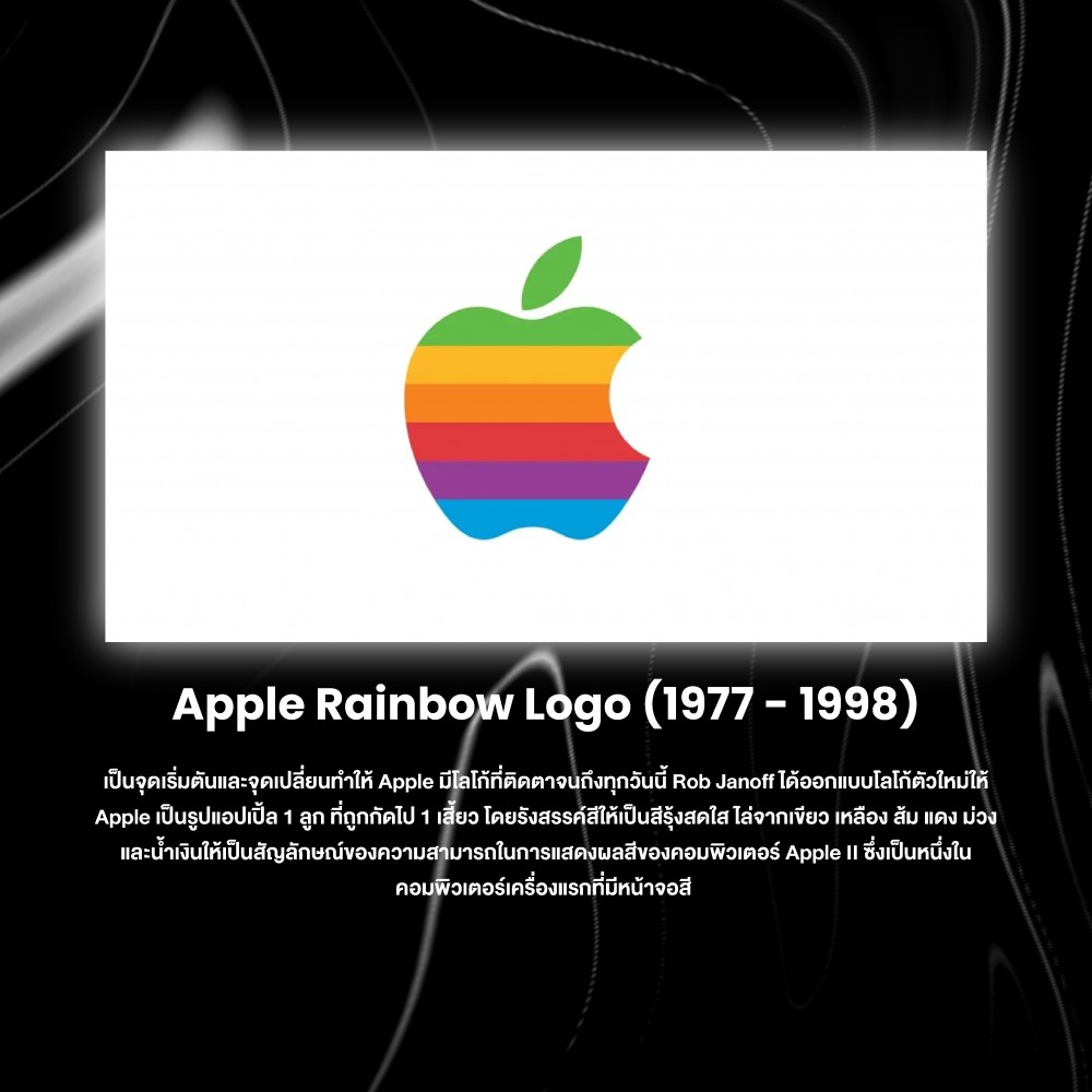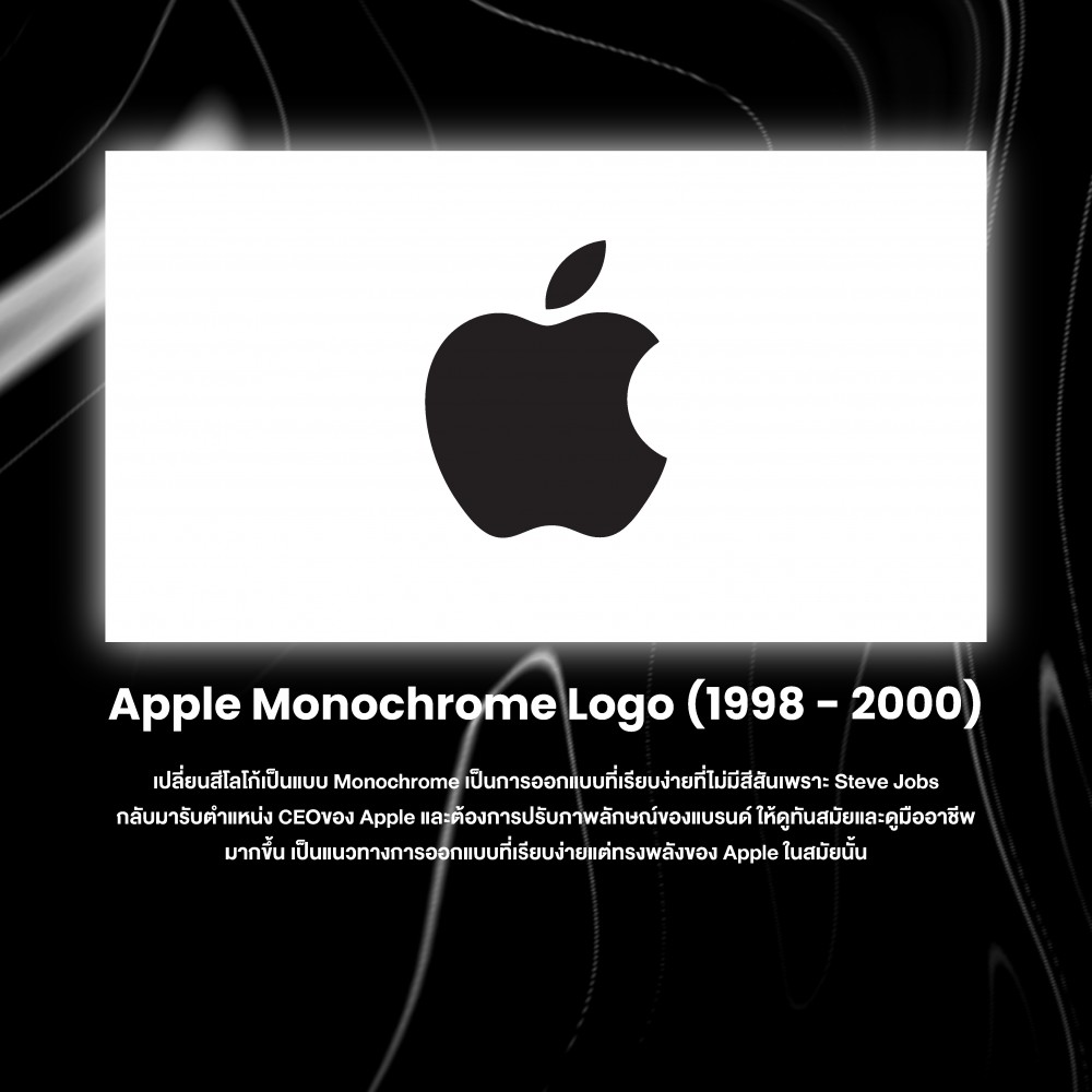 โลโก้สีรุ้งที่เป็นจุดเริ่มต้นของความติดตา ต่อมาในปี 1998 ก็ได้มีการเปลี่ยนแปลงเกิดขึ้น Apple ได้เปลี่ยนสีโลโก้เป็นแบบ Monochrome เป็นการออกแบบที่เรียบง่ายที่ไม่มีสีสันเพราะ Steve Jobs กลับมารับตำแหน่ง CEO ของ Apple และต้องการปรับภาพลักษณ์ของแบรนด์ ให้ดูทันสมัยและดูมืออาชีพมากขึ้น ข้อดีคือโลโก้สามารถใช้งานได้หลากหลายขึ้น เข้ากันดีกับการออกแบบผลิตภัณฑ์ที่เน้นความเรียบง่ายแถมยังดูหรูหรา เป็นแนวทางการออกแบบที่เรียบง่ายแต่ทรงพลังของ Apple ในสมัยนั้น