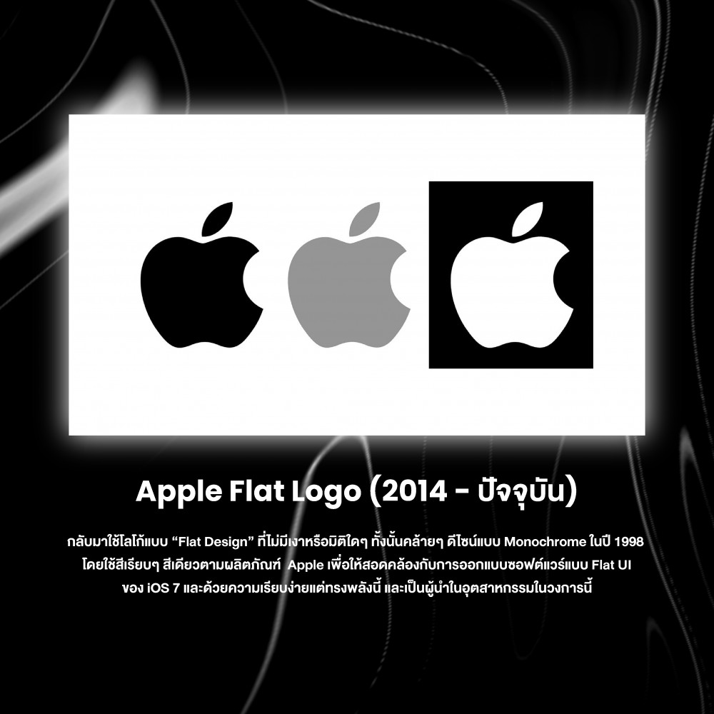 หลังจากถูกดีไซน์ให้เงาวาวมาสักพัก Apple ก็เหมือนจะเปลี่ยนใจกลับมาใช้โลโก้แบบ “Flat Design” ที่ไม่มีเงาหรือมิติใดๆ ทั้งนั้นคล้ายๆ ดีไซน์แบบ Monochrome ในปี 1998 โดยใช้สีเรียบๆ สีเดียวตามผลิตภัณฑ์ Apple ทางบริษัทต้องการให้โลโก้กลับมามีดีไซน์ที่เรียบง่าย ทันสมัย และใช้งานได้ดในทุกแพลตฟอร์ม เพื่อให้สอดคล้องกับการออกแบบซอฟต์แวร์แบบ Flat UI ของ iOS 7 และด้วยความเรียบง่ายแต่ทรงพลังนี้ ก็ได้สื่อถึงความทันสมัยและเป็นผู้นำในอุตสาหกรรมในวงการนี้ และ Apple ก็ยึดโลโก้นี้ใช้มาจนถึงปัจจุบันนั่นเอง